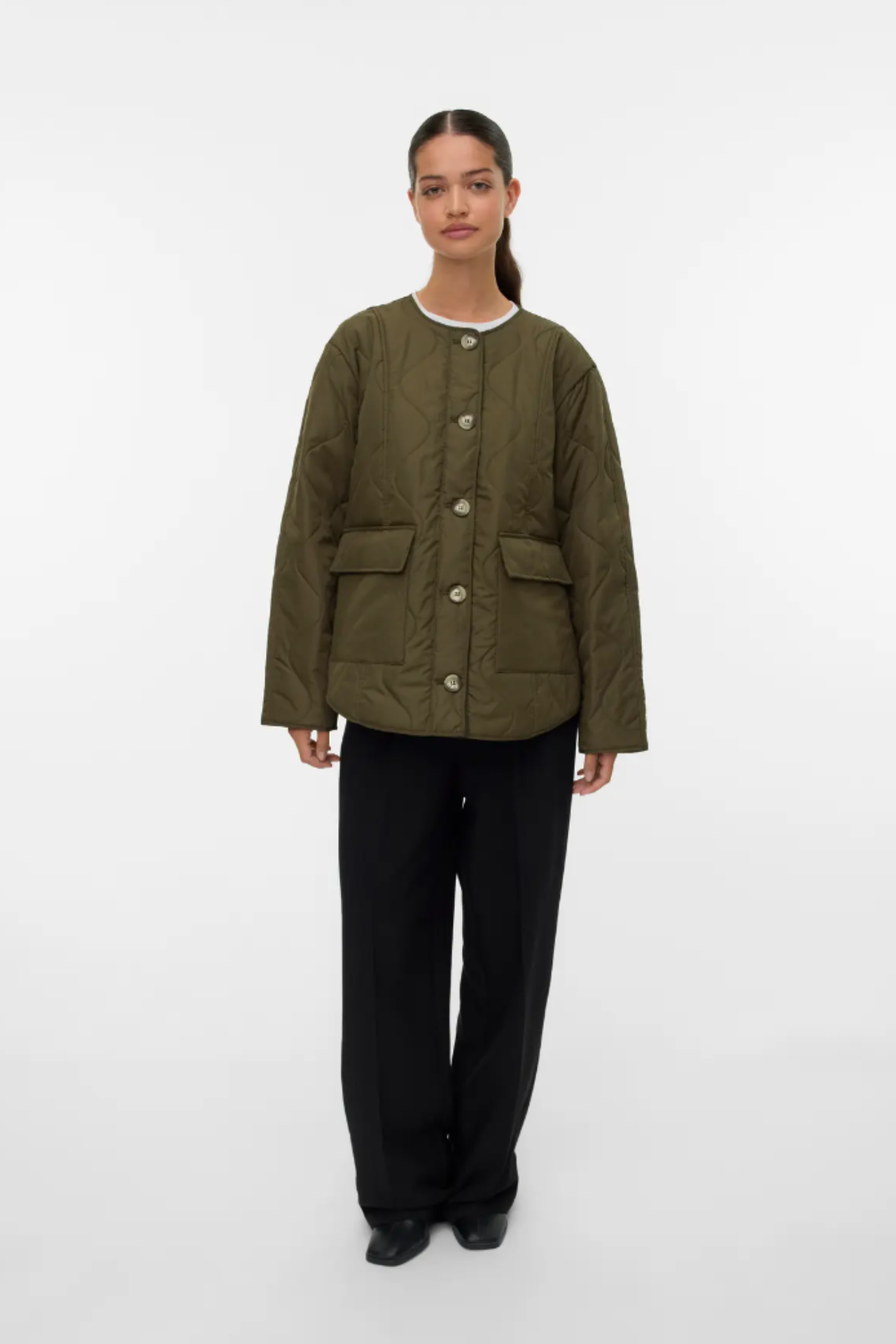 - Front button closure.