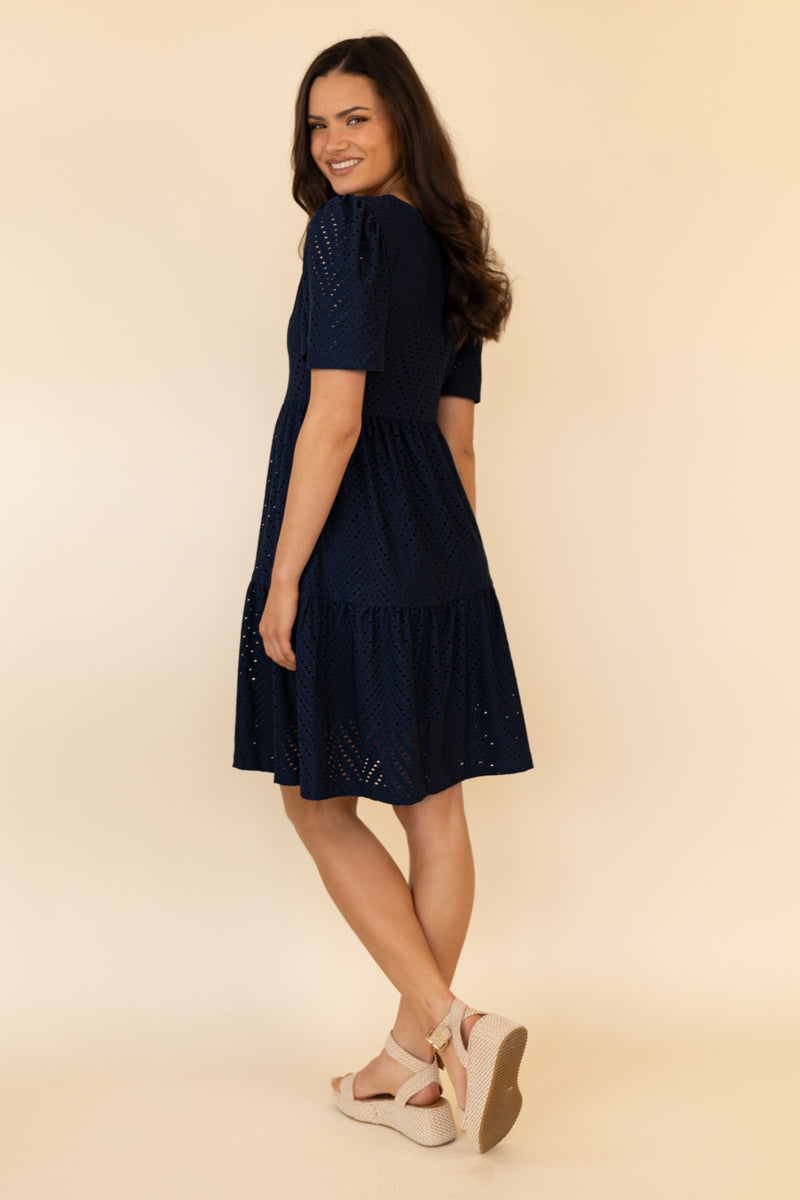 This gorgeous dress features intricate navy Anglaise detailing, adding texture and depth to your look. Perfect for any occasion, this mini dress will have you feeling confident and chic.