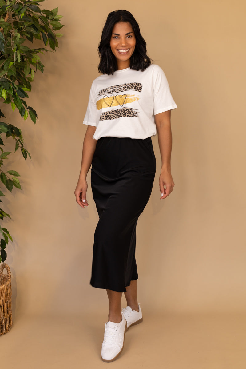 The high waist design of the midi skirt flatters the figure and adds a touch of sophistication.